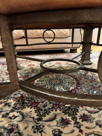 Beautiful coffee table featuring a tan leather top with a unique flower-like shape and cream trim. The surface has subtle texture and natural wear that adds character. The table sits on sturdy metal legs, giving it a clean and balanced look.