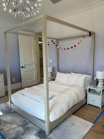 PB KIds Costa Full Canopy Bed in weathered white finish. Excellent condition.