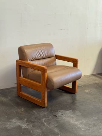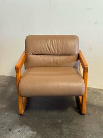 Vintage 1970s Mid-Century Modern leather armchair, featuring tan leather upholstery and a solid oak frame, highlighting the era’s elegant and functional design.