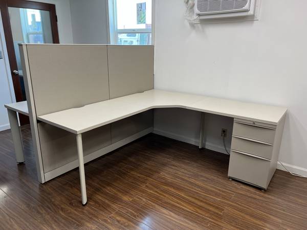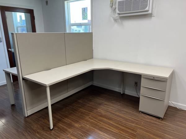 T configuration double station with 54" high panels. each station is 6'x6' with locking pedestal drawers.