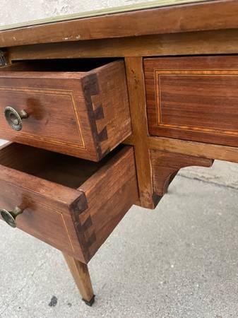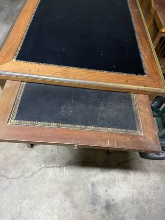 It does not have a lock. It’s missing the center drawer pull as well as one other drawer pull. The desk has extensions on each side. Super sturdy ! Can deliver.