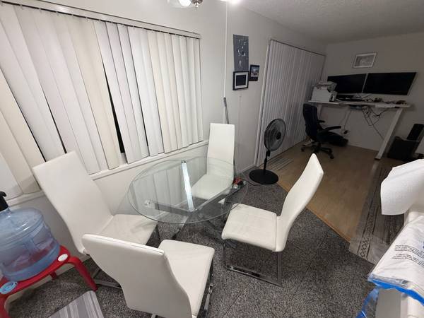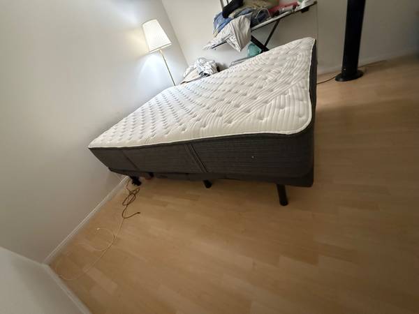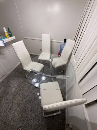 1. Queen Mattress + Automatic Bed Frame – Originally $2,500 from Mattress Firm, selling for $1,500 2. Side Lamps (2) – $50 each 3. Glass Dining Table + 4 White Leather Chairs + 2 Matching Bar Stools...