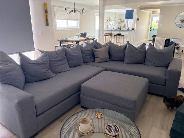 Sectional couch. Blue denim color. Water stains on one of the cushions. Can easily be covered with a blanket or be reupholstered. 10‘ x 8 1/3’. 40 inches deep. Very comfortable and cozy with ottoman...