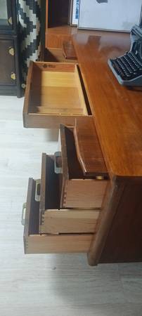 Multiple drawers for storage, including 3 pull-out writing surface or keyboard tray.