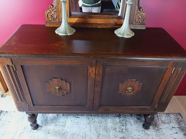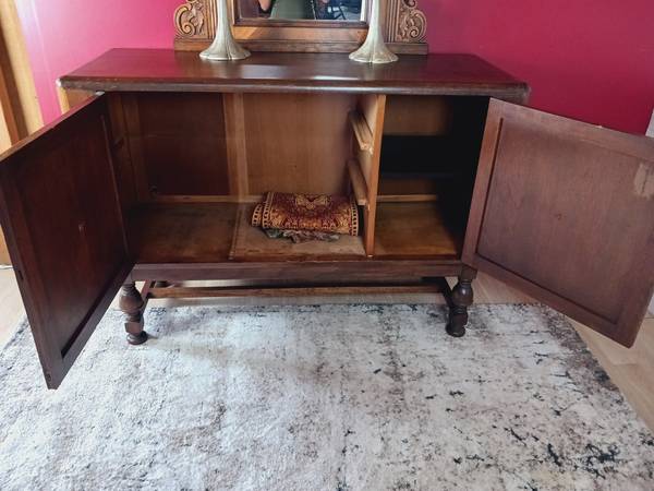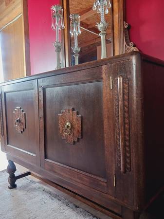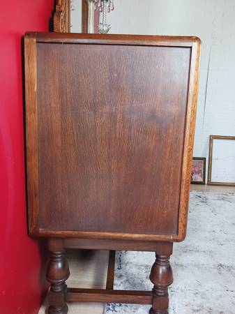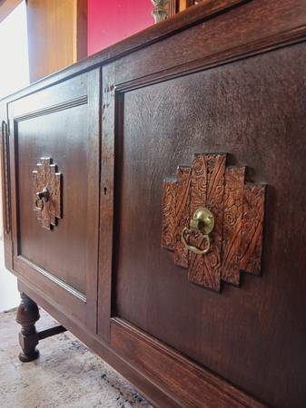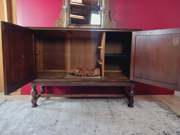 Available, 53 length, 20 depth, 37.5 height. Two large doors with large brass pulls. Finial carved legs. This is an antique tiger oak sideboard or buffet, likely from the early 1900s, featuring...