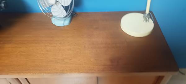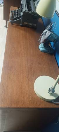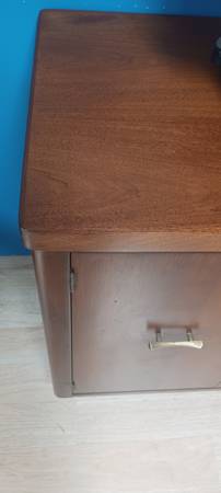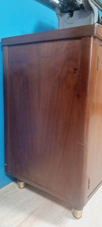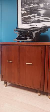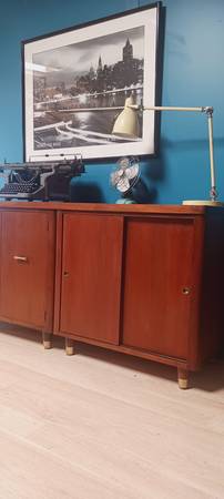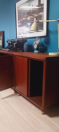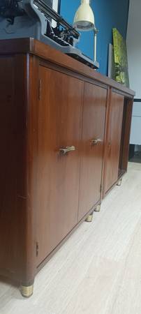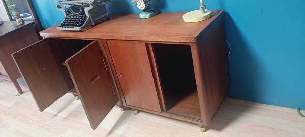 All wood credenza, for records and a full-on entertainment center with wire access at the back ... Beautiful brass metal pulls.