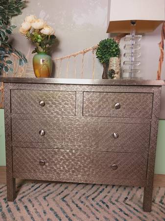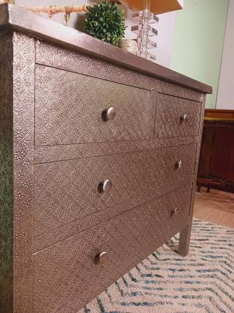 Crafted of mango wood wrapped in hand-embossed metal, the Embossed Metal Dresser is rich with character and texture versatility. It features a medallion motif, four roomy drawers and a premium-quality finish treatment, making this World Market exclusive a must-have piece at a affordable price.