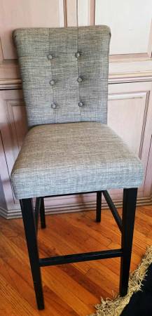 GREY FABRIC, COUNTER BAR STOOL THAT MEASURES 44" HIGH x 17 1/2" WIDE. IN EXCELLENT CONDITION.
