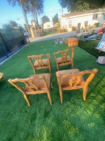 GOOD VINTAGE SET OF FOUR CHAIRS SOLID OAK WOOD LIGHT BROWN ONE HAS ARM REST ALL FOR ONLY $ 40.00 FOR MORE INFO PLEASE CALL MIKE AT THANKS...