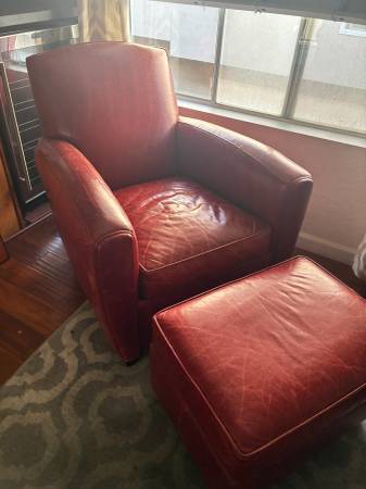 One (1) Braddington custom leather lounge chair with matching Footstool.