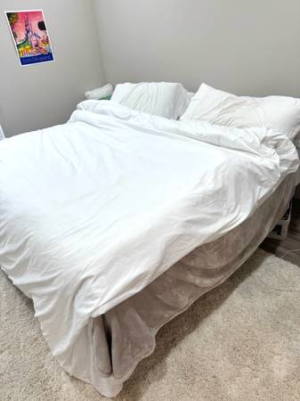 Less than 1 year old Leesa king size mattress Sapira hybrid. Optional Add On: Revival New York hotel quality white bed sheets, hotel quality duvet and 2 hotel quality king size pillows (the bedding alone was $1000+).