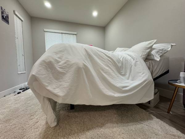 Sleep in zero gravity or use tilt yourself up for reading, journaling. Less than 1 year old Adjustable bed frame. Excellent condition, comes with remote and has massage features