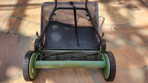 Manual lawn mower with rear basket for sale. Good Condition. Five blades, with adjustable height. $60.