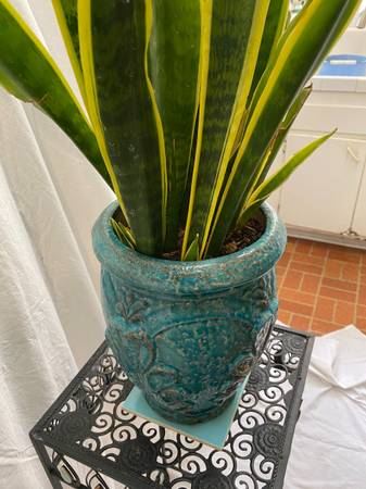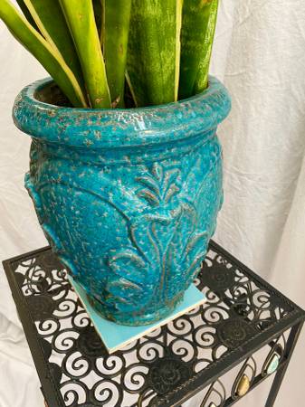 From Grammas Collection of Garden Treasures, we have a very happy, successful plant thriving in a flawless turquoise blue container. The combination of the colors is so attractive. Bring pizzazz into your room or garden with this lovely plant..