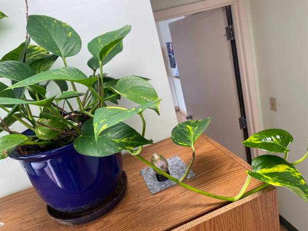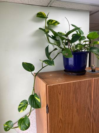 I have some very healthy successful Golden Pothos plants in a beautiful navy blue, ceramic container with built in saucer. The plant is well established with healthy roots and busting at the seams gorgeously happy.