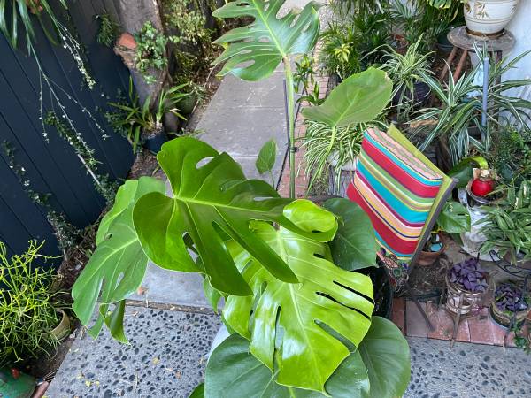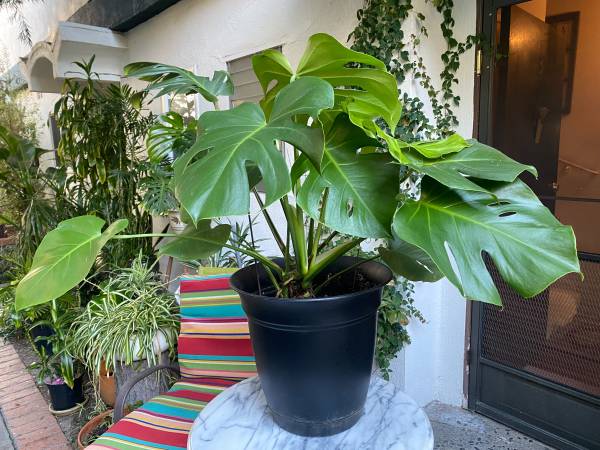 This gorgeous, gorgeous Monstera Deliciosa is well established busting at the seams beautiful! I have nurtured it to be happy and healthy. The plant spreads 46" wide by 40" tall. It is prolific in its growth and has several new leaves just unfolding. If fed plant flower food, it will bloom with a delicious edible fruit. It may take a while to get there even though this plant is so well established.