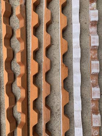 (10) Redwood redwood corrugated panel closure strips. Used with Home Depot style SunTuf corrugated patio panels. Some are partially painted (see photos). $10/OBO. Feel free to give me, Rudy, a call anytime at show contact info