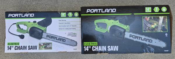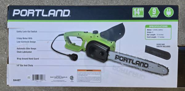 CHAINSAW 14" ELECTRIC 14" Bar and Chain (uses Oregon brand replacement!) 120 VAC 60Hz Cord length 17 inches 9 AMP Motor Low Kickback Design Automatic Oiler keeps chain lubricated Wrap around chain...
