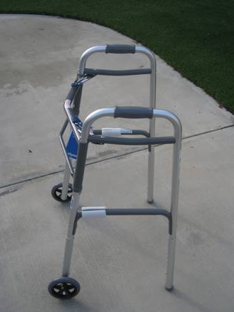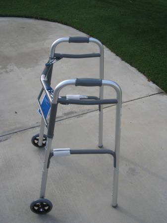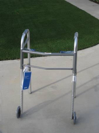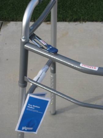 NEW ProBasics 2-button folding aluminum walker. Lightweight, rated at 300-pound capacity. Height is adjustable in 1-inch increments. Folds easily for loading into a car or to save space.