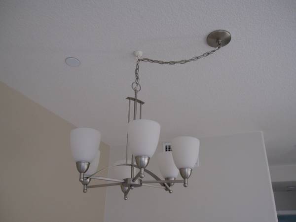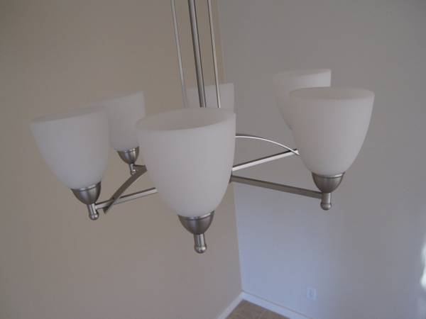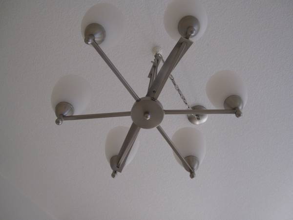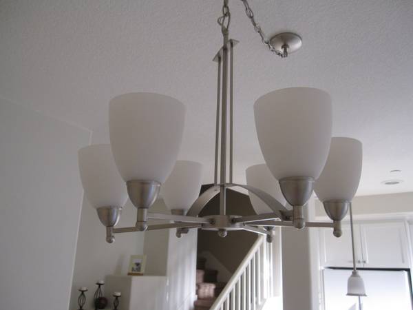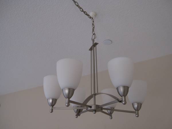 Contemporary brushed metal frame chandelier holds sixed etched glass bowls in 6-light chandelier. Chain which holds the fixture securely to the ceiling with ceiling face plate included. Piece measures 22 inches tall with an additional chain to adjust how far down from the ceiling it hangs and its widest measurement is 2 feet and a 1/4 inch in diameter. The light fixture is still in perfect working condition. Removed it only to install a ceiling-flush mounted light fixture instead.