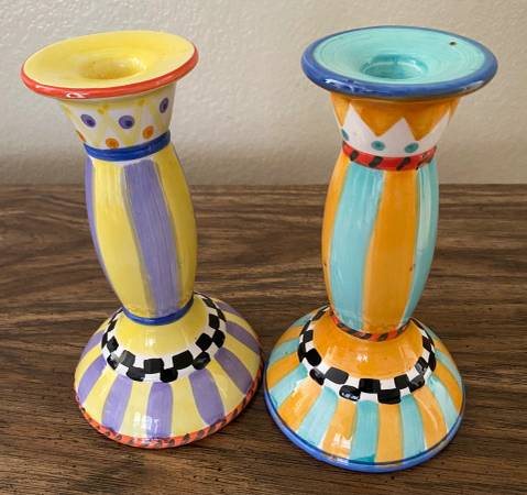 4. set of 2~ World Bazaar Inc Whimsical, colorful candle sticks. For tapered candles. Measures approx 7 1/2"L x 4 1/2" at widest. - $7 obo (On Ebay for $15)