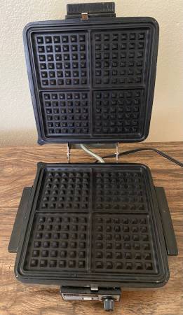 This is a collectible kitchen appliance from the 1960s. It's reversible plate waffle maker has a capacity to bake 4 waffles at a time and operates on an electrical power source with 900W of power. The sleek silver color and iconic General Electric branding make it a sought-after piece for vintage appliance collectors. The set includes the waffle baker and reversible plates, making it a functional and stylish addition to any kitchen.