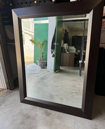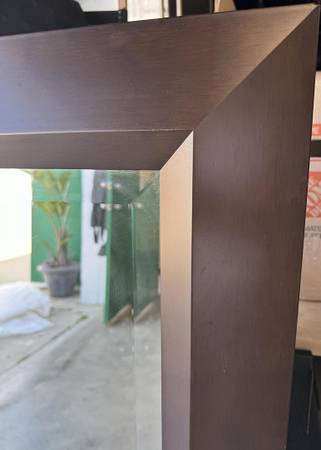 Large modern wall mirror- laminated wood grain espresso color. Is a 1" beveled mirror; minor chips on a couple of corners. It can be hung vertically or horizontally.