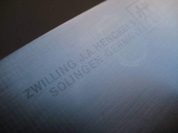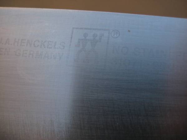 THIS IS A GERMAN MADE KNIFE.. Genuine German Skills made this knife! Zwilling Henckels 8 inch chefs knife made in Solingen Germany is used but still has the original incredible quality of Stainless Steel perfected in Deutchland and will give a lifetime service for your family when they inherit it. Recently serviced and sharpened and honed sharp as a razor. No "chips" in the edge..