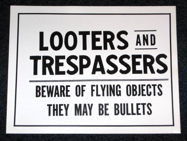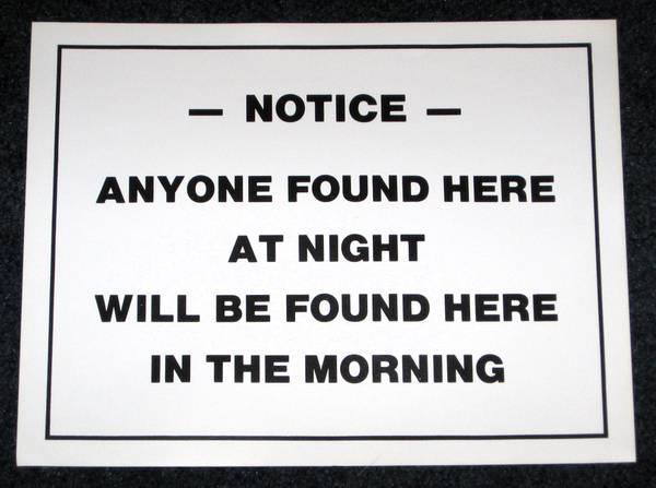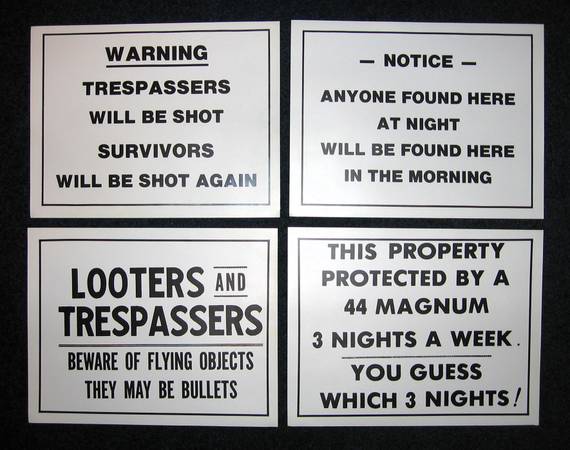 Brand New Set of 4 Humorous Funny No Trespassing Signs. Great for Bars, Houses, Stores, Man Caves, Garages and more! Printed on flexible no tear type sturdy vinyl material. Each sign measures 8-1/2” x 11”