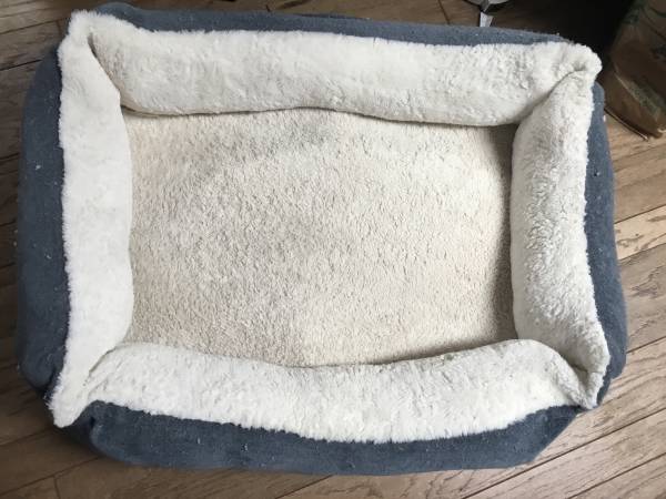 The bed has some stains, but is in good condition. It has a removable polyester cover and a non slip bottom. It measures 44” X 31” X11.5”.