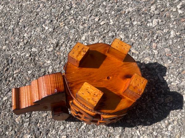 This adorable wooden holder can hold a small plant. I think it is a pig.