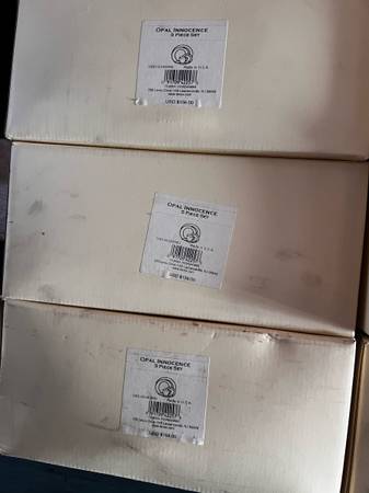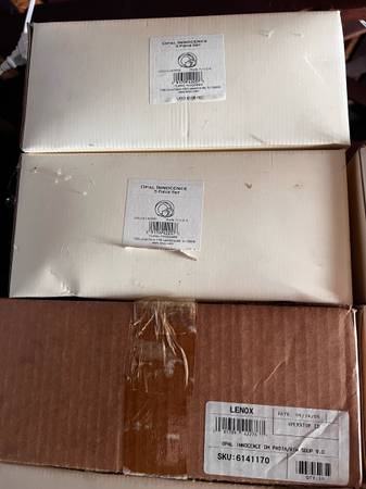 These have never even been opened. Each box is a brand new 5-piece dish set. And it comes with the brown box which is bowls. This whole collection would be for 10 people. Asking $100 per box but take the whole thing and we’ll make a lovely deal.
