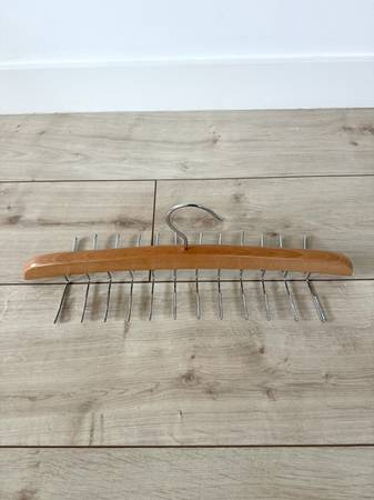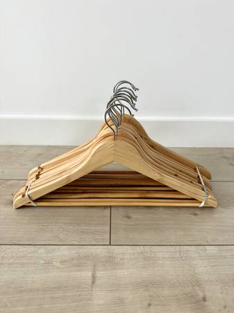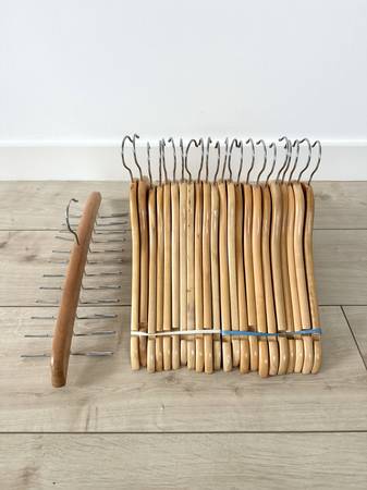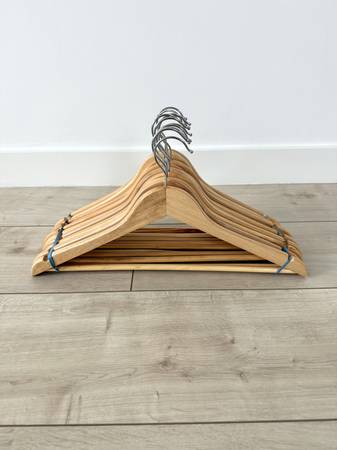 A bundle of wooden hangers: 22 standard clothing hangers + one tie hanger. Exact cash or Venmo. Pick-up is near Venice High School.