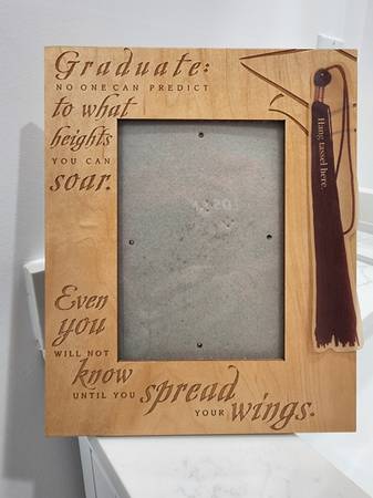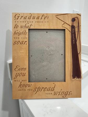 Like New Natural Wood 5 x 7 Graduate Frame. No flaws, in perfect condition. Has a space for a 5 x 7 frame and has a place to hang a tassel. Has a nice motivational saying imprinted into the wood....