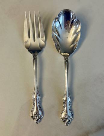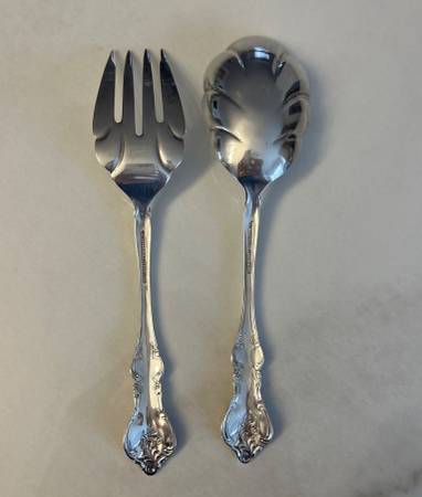 Vintage 9" serving spoon and fork set from International Deepsilver's Orleans pattern. The Victorian design and silverplate composition make it a perfect choice for special occasion. The set is post-1940 and features the Orleans pattern, adding a touch of elegance to any table. Whether you're a collector or looking for a unique piece of flatware, this serving spoon and fork set is sure to impress.