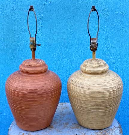 Pair of mid century ceramic beehive lamps. 12" across by 25" tall to the finial. No chips or cracks but has a few minor scratches. Great earth tones. $345 for the pair of $180 each.