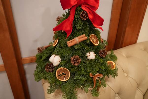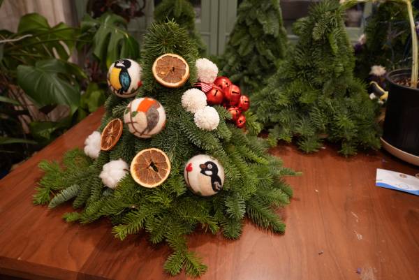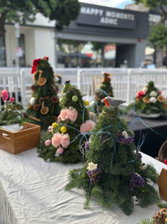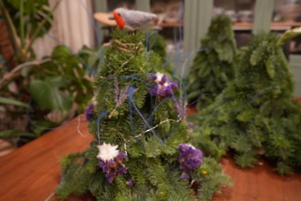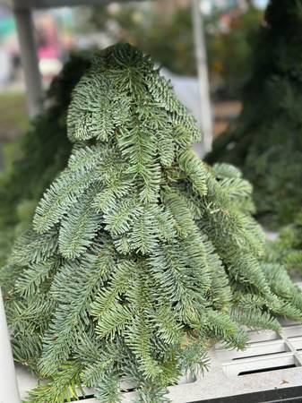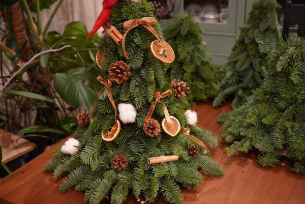 They are handmade table Christmas tree from real Noble Fir tips. The tree is $40 and decorated one is $60. We also have many ornaments for sale.