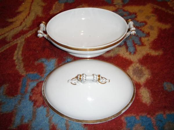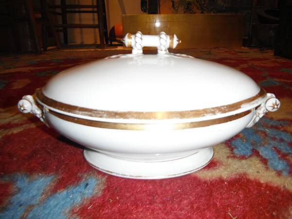 This is a vintage porcelain covered vegetable bowl with lid. The edges have 24 k gold trim, small amount of loss but beautiful. The bottom is marked "Haviland". Both pieces are in great condition with no chips or cracks.