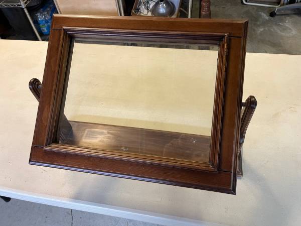 Wooden table top frame, rotates and has two panes of glass to hold a document or print/picture.