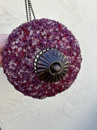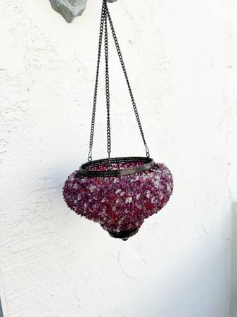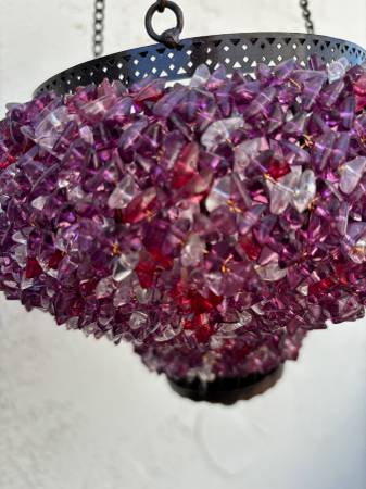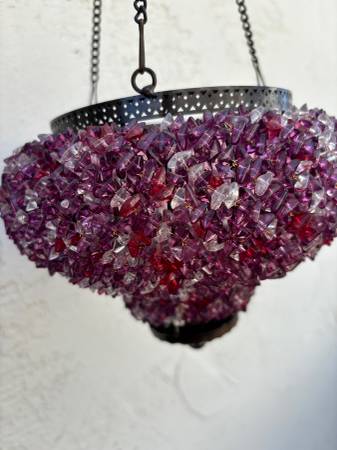 Hi, This candle holder is really my vibe however I really never had a cool place to view it so it is unused (candle-wise). It is primarily purple with a touch of pink & clear or white beads hanging by metal chains and holds tea light size candles..