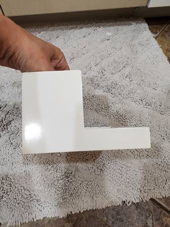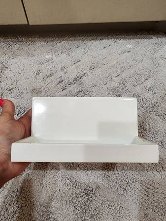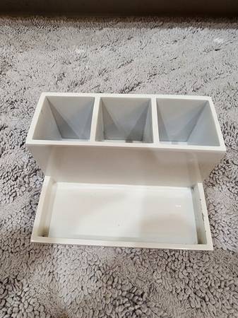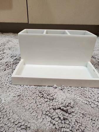 White Lacquer 3 Compartment Bathroom Organizer. Modern, square design. Features 3, 2.5 inch compartments to store hair ties, toothbrushes, toothpaste, cotton balls, makeup brushes, cotton q-tips, etc. Also has a front tray to organize perfume, lotions, serums, etc. Tray measures 7.5 in long and 2.5 in wide. Already cleaned and sanitized. There are some areas where the paint has come off (see photos) but only noticeable if you are really looking. High quality, sturdy, and weighs 5 pounds. Paid $20 for it.