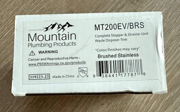 - Brand New In Box Mountain Plumbing Products brushed stainless steel strainer + stopper for garbage disposals drains - Model# MT200EV/BRS $40 or better offer