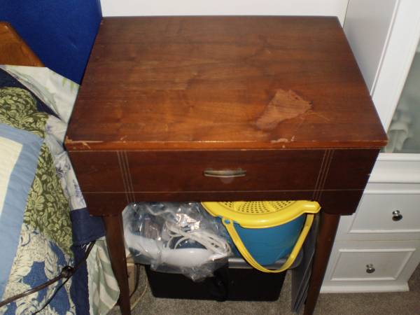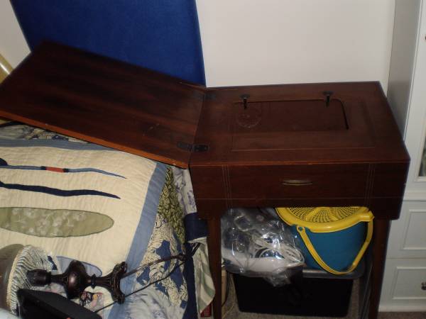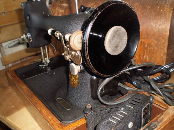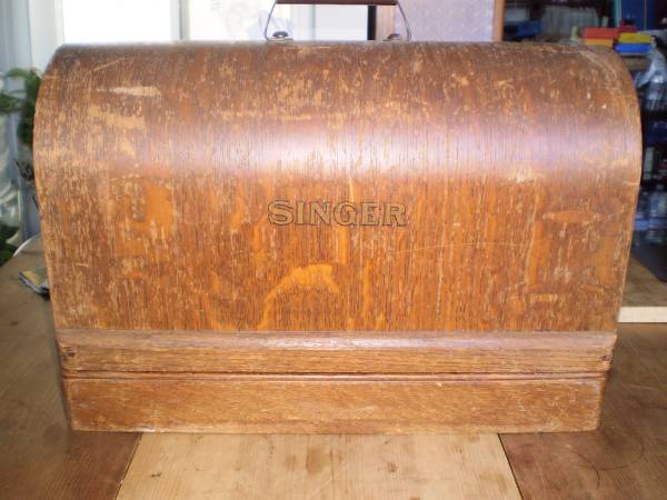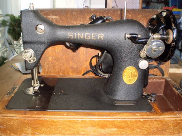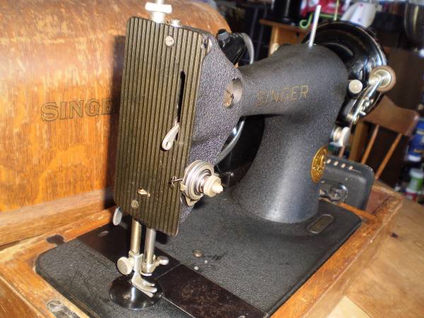 Great looking Singer 128 sewing machine with the rare Godzilla finish - works wonderfully - comes with extra slide plate and bobbin (but no case key) - compact and portable, this is a precursor to the Featherweight, but the shuttle mechanism and bobbin winder are so much cooler! Comes with the very desirable Singer bentwood case and cute little sewing desk! Learn to sew yourself or teach your children. This is perfect for beginners and expert sewers! Even if you don't sew, this is a great decoration and conversation piece you won't regret owning!
