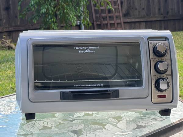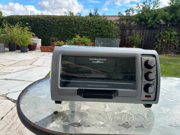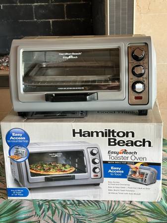 Hamilton Beach, in box, used less than a year. 6 slice countertop toaster oven with easy reach lift up door, bake, broil & toast functions, fits 11” pizza, toast functions, auto shutoff, silver....