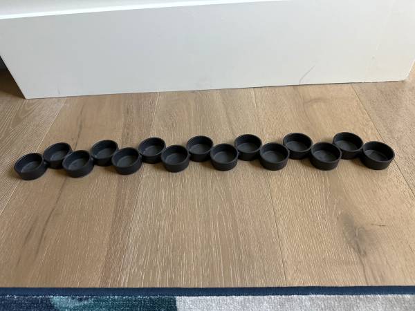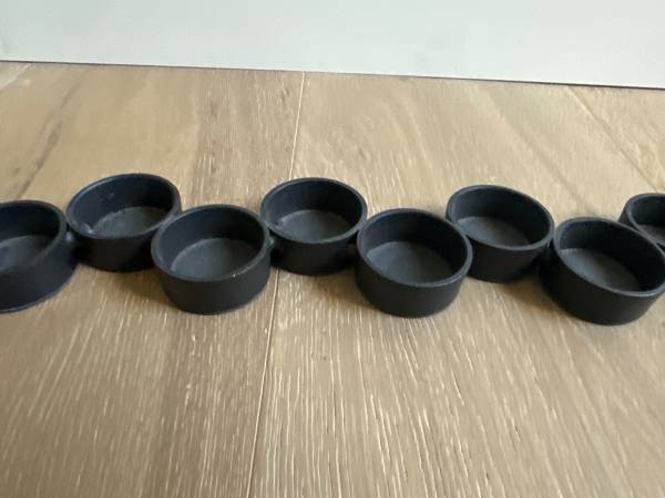 Votive candle holder, black metal, new. Holds 15 votive candles. Great for center piece along center of table or on a bookshelf or table, etc. Measures 26” long by 3” wide by 0.75” tall.