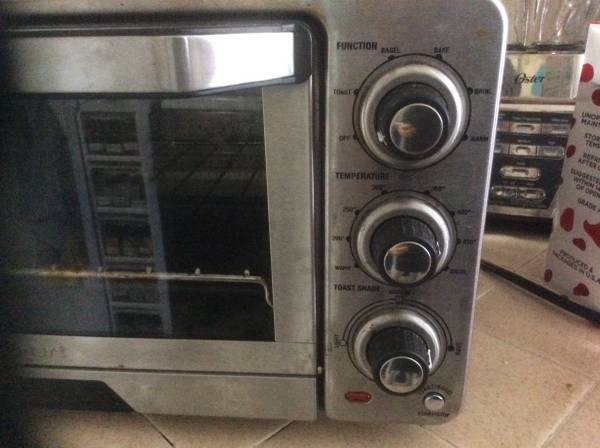 Toaster oven is a Quisinart with various settings. It bakes muffins, cookies, chicken, and casseroles. Medium sized. Measures 15” x 16” X9 1/2”. Retails for $100.