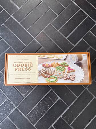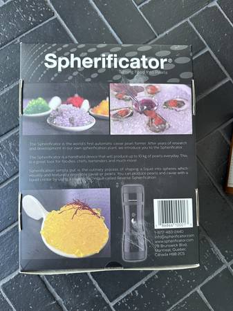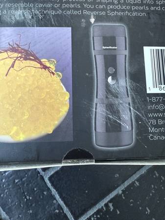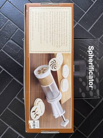 The cookie press is great for the holidays! Has a variety of cookie press shapes included, in great condition - for making Spritz cookies, sugar or spice cookies, etc. Also an unopened, unused "Spherificator" to make fun boba like "pearls" for drinks or faux-caviar for fancy meals - or whatever you imagine - great for foodies. It retails for around $99.