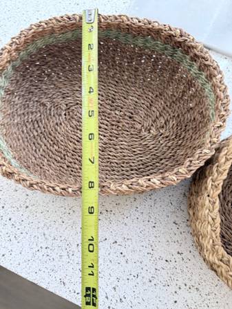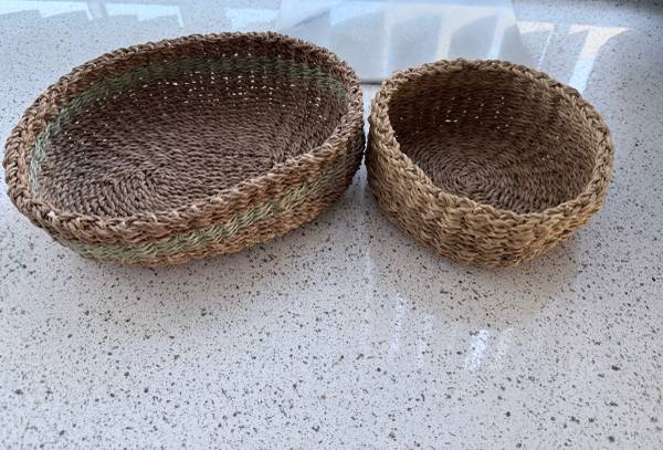 Hand woven baskets one oval 8Wx11Dx2H inches and one round 8Dx2H inches Add warm texture to your sanctuary with these beautiful handwoven basket bowls. Perfect for storing fruit and vegetables and...