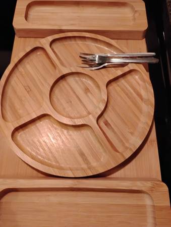 Fish platter Two large metal trays Cheese / fruit board Cutting boards XL plastic and wood Large tray $5 each or all $25 Additional cake 4 platters $4 each or all $15