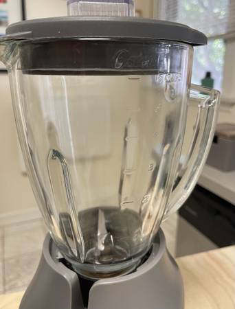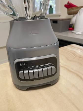 Oster Pulverizing 800 Watts 6-Cup Power Blender in gray. It features a glass jar, 8-speed settings, and push-button controls for functions like stir, mix, chop, blend, puree, liquify, and pulse. It is designed for crushing ice and blending frozen fruits and vegetables.